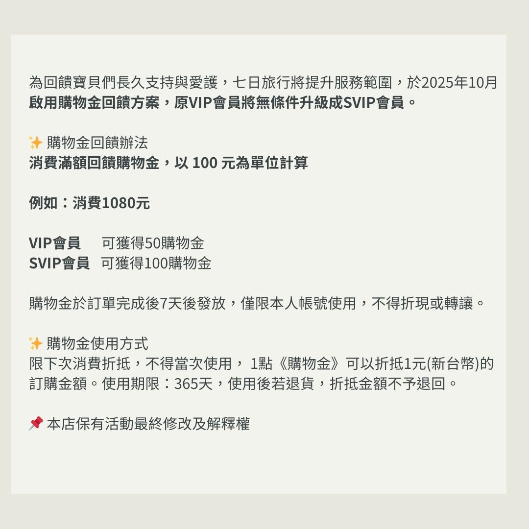 七日旅行將提升服務範圍,於2025年10月啟用購物金回饋方案
