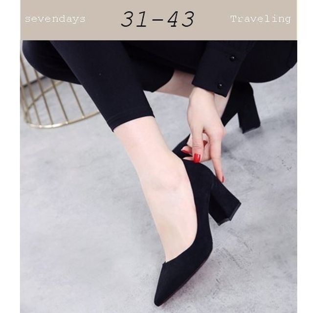 尖頭蜜桃絨布質感素面粗跟中跟鞋高跟鞋工作鞋黑色(31-43)
