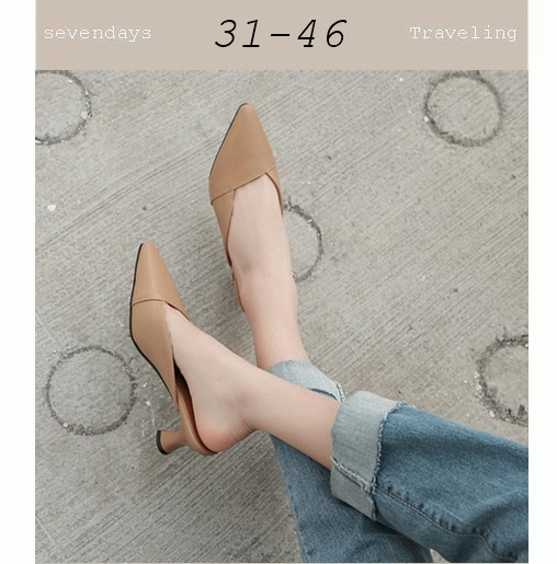 尖頭素色拼接穆勒拖鞋跟鞋涼鞋奶茶色(31-46)