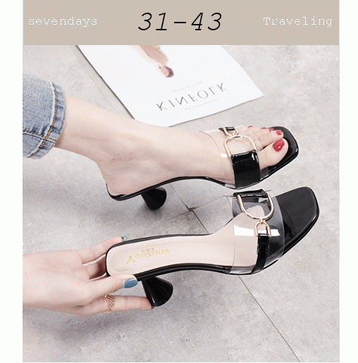 方頭大小D金屬裝飾矽膠魚口中跟拖鞋涼鞋黑色(31-43)