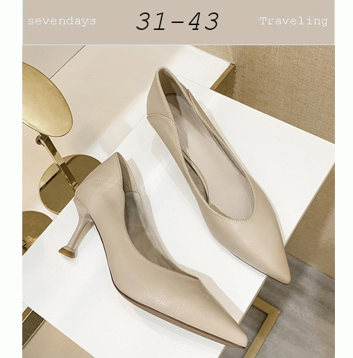 尖頭V可踩腳細跟高跟鞋中跟鞋杏色(31-43)