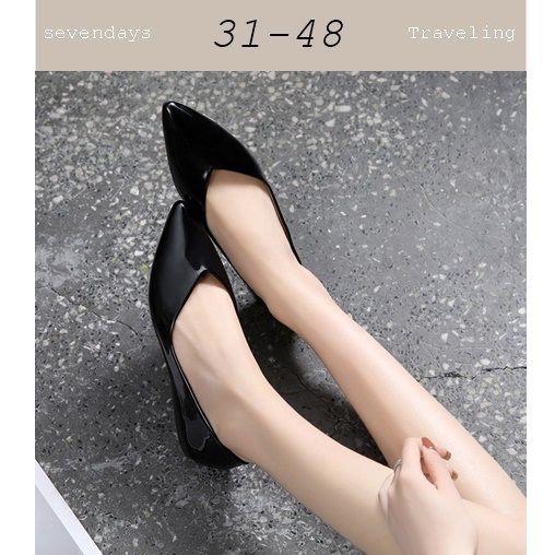 尖頭V口軟質漆皮時尚平底鞋娃娃鞋包鞋黑色(31-48)