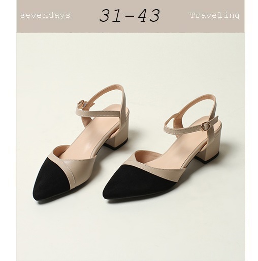 尖頭拼色小香風粗跟繞帶涼鞋黑杏色(31-43)