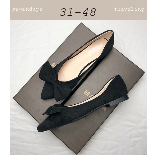 尖頭絨布V口不對稱蝴蝶單色平底鞋包鞋娃娃鞋黑色(31-48)