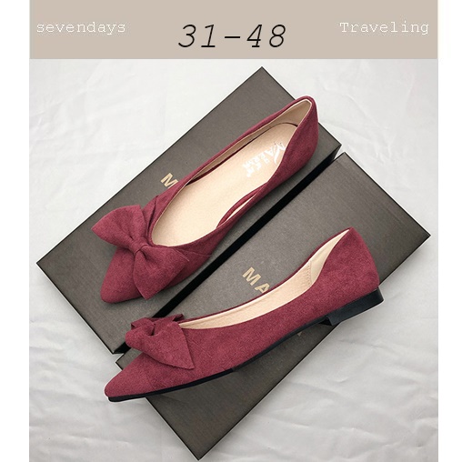 尖頭絨布V口不對稱蝴蝶單色平底鞋包鞋娃娃鞋深紅色(31-48)