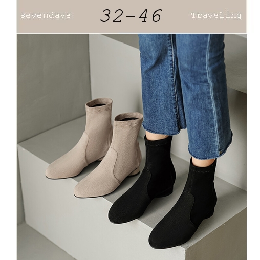 圓頭蜜桃絨布矮圓跟襪套靴短靴女靴黑色(32-46)