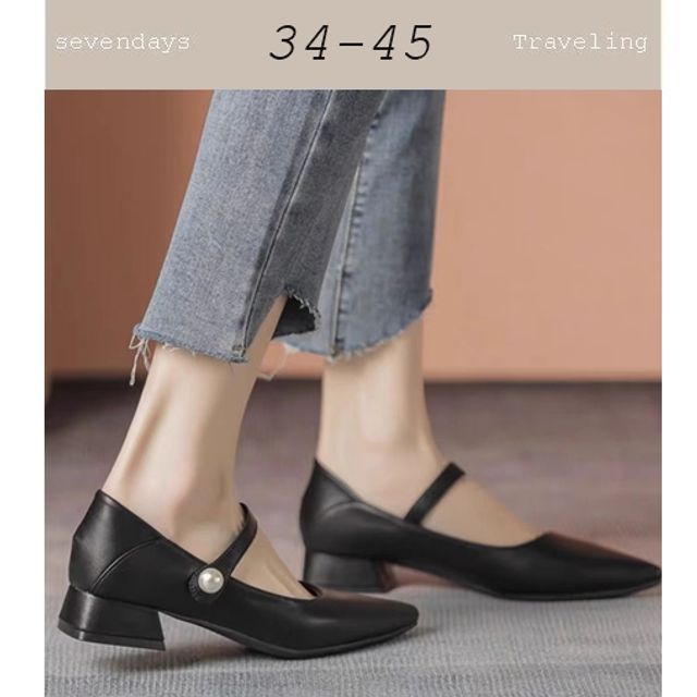 尖頭瑪莉珍一字扣魔鬼氈矮跟低跟鞋黑色(34-45)