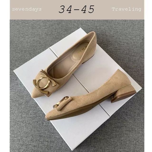 尖頭雙C扣金屬質感軟絨布矮跟鞋低跟鞋黑色(34-45)